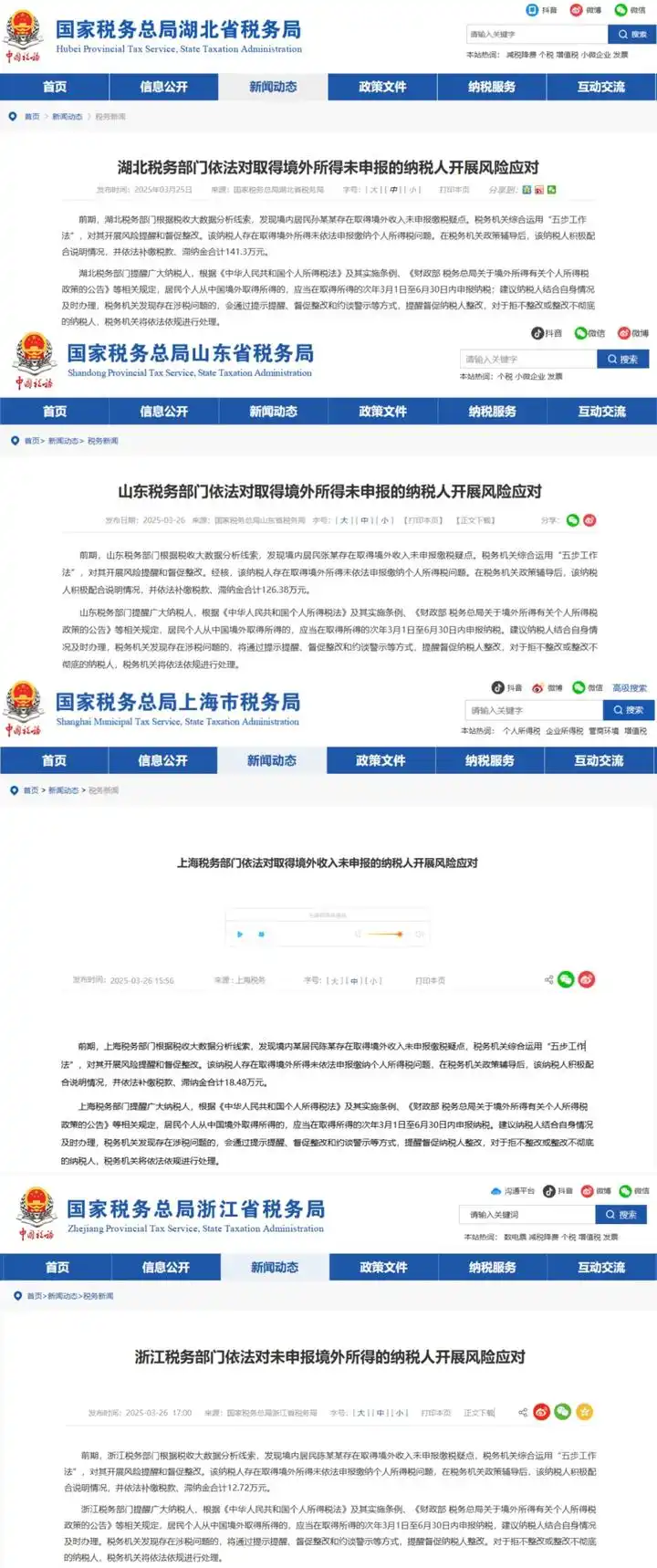今年3月底,湖北、山东、上海、浙江四地税务局通过官网发布“依法对取得境外收入未申报的纳税人开展风险应对”的新闻。