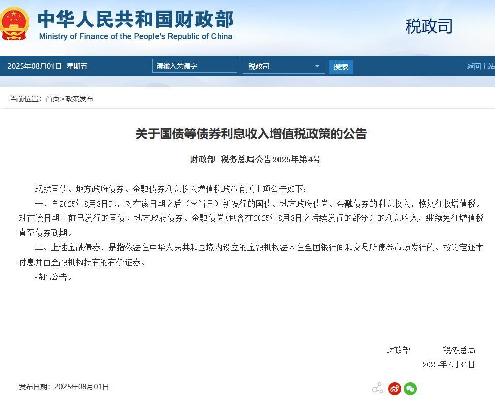 近日,重磅消息一条接一条。《金融时报》刊文3天前,也就是8月1日,财政部、税务总局公告称,自8月8日起,对新发行的国债、地方政府债券、金融债券的利息收入,恢复征收增值税。