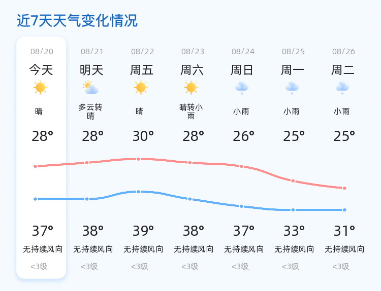 未来三天,菏泽市天气以晴到多云为主,最高气温预计将达到39℃,最低气温在28℃左右。周五(8月22日)天气晴朗,适合户外活动;周六(8月23日)晴转小雨,市民需注意携带雨具;周日(8月24日)至下周初,小雨天气持续,气温略有下降。建议市民关注天气变化,合理安排出行计划。