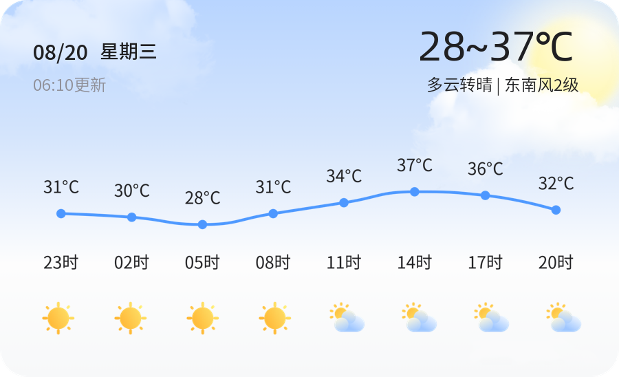 今天是8月20日,星期三,农历闰六月廿七。菏泽市今天天气多云转晴,东南风2级,气温介于28℃至37℃之间,空气湿度为78%,PM2.5指数为27,空气质量良好。各区天气情况总体平稳,温度适宜,适合市民户外活动。