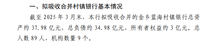 青农商行公告显示,截至2025年3月末,上述3家村镇银行的总资产规模合计约54.32亿元。其中,金乡蓝海村镇银行总资产37.98亿元,平阴蓝海村镇银行总资产8.35亿元,日照蓝海村镇银行总资产7.99亿元。此外,金乡蓝海村镇银行总负债34.98亿元,平阴蓝海村镇银行总负债7.61亿元,日照蓝海村镇银行总负债7.61亿元。吸收合并完成后,3家村镇银行将注销法人资格,其全部业务、财产和债权债务都将由青农商行承继。