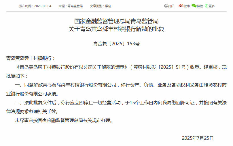 黄岛舜丰村镇银行解散