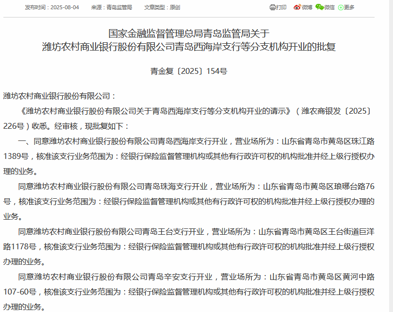 当前,岛城“村改支”进度正在积极推进中。8月4日,国家金融监督管理总局青岛监管局发布两项行政许可批复(青金复〔2025〕154号、153号),同意潍坊农商银行青岛西海岸支行、青岛珠海支行、青岛王台支行、青岛辛安支行、青岛琅琊支行、青岛泊里支行、青岛灵山卫支行、青岛隐珠支行、青岛张家楼支行、青岛大场支行、青岛薛家岛支行在内的11家分支机构开业。此外,同意青岛黄岛舜丰村镇银行解散,行内资产、负债、业务及各项权利义务由潍坊农商银行承接。