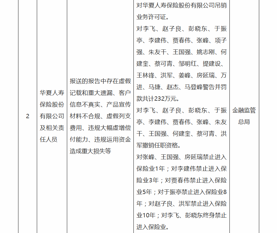 近日,金融监管局开出罚单,“剑指”华夏人寿及相关责任人,而华夏人寿至此也彻底退出市场。罚单显示,华夏人寿的主要违法违规行为包括报送的报告中存在虚假记载和重大遗漏、客户信息不真实、产品宣传材料不合规、虚假列支费用、违规大幅虚增偿付能力、违规运用资金造成重大损失等。针对以上违法违规行为,金融监管局吊销华夏人寿的业务许可证。此外,23名相关责任人员被警告并罚款共计232万元,12名相关人员被撤销任职资格,多人被禁止进入保险业,期限由1年到终身不等。此次监管部门通过吊销牌照、终身禁业的“组合拳”,终结了华夏人寿的违规路径。