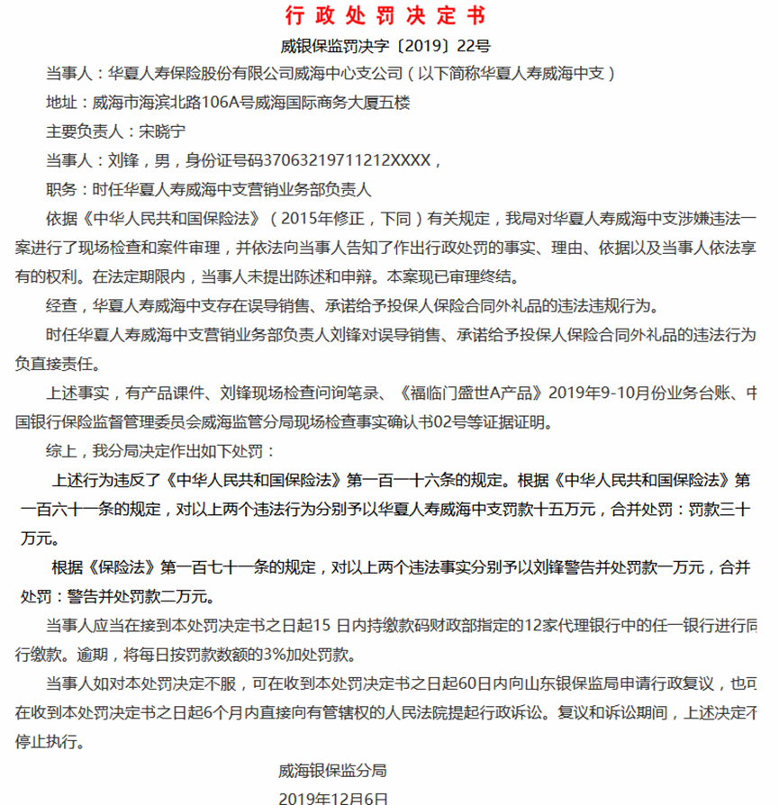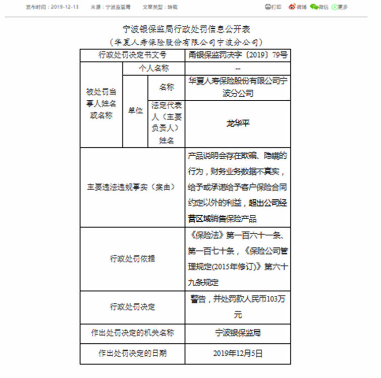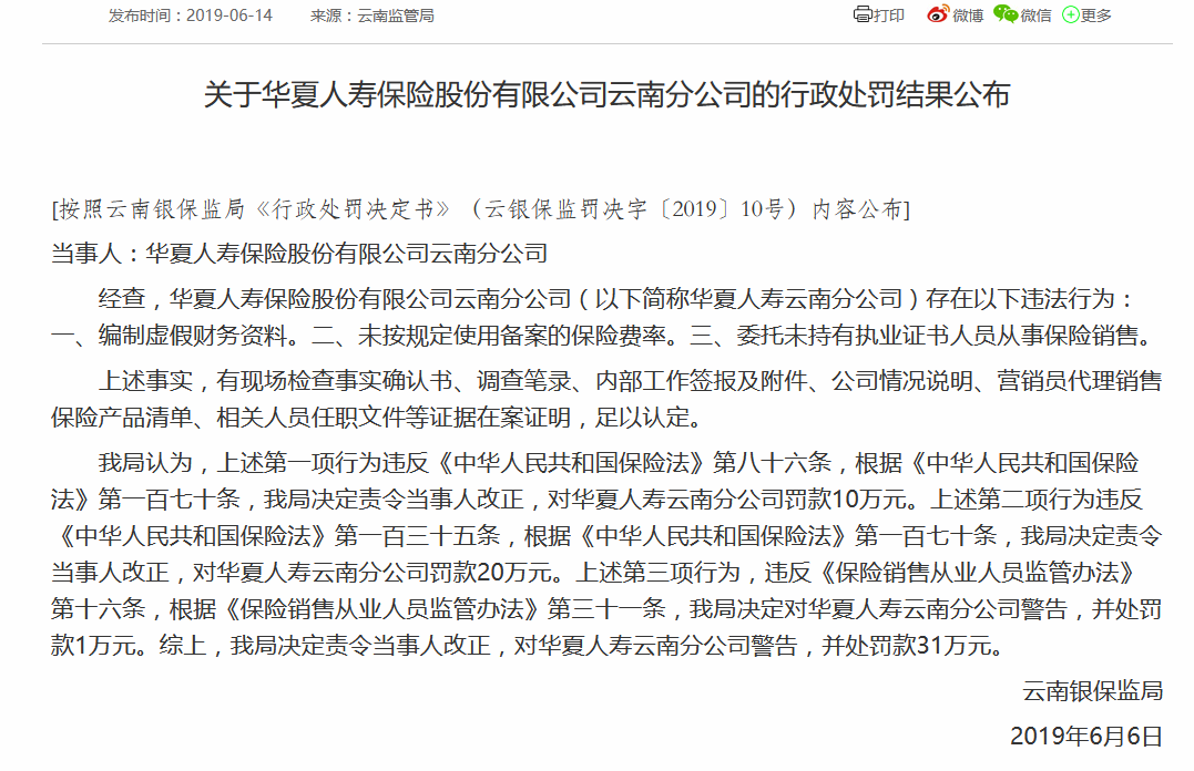 2020年7月被原银保监会接管前,“警钟”已经敲响,监管部门公布多张罚单,该公司因销售误导、虚假宣传、资金运用违规等问题被监管处罚。2019年6月6日,华夏人寿云南分公司因编制虚假财务资料、未按规定使用备案的保险费率、委托未持有执业证书人员从事保险销售被罚款31万元。2019年12月5日,华夏人寿宁波分公司因产品说明会存在欺骗、隐瞒的行为,财务业务数据不真实,给予或承诺给予客户保险合同约定以外的利益,超出公司经营区域销售保险产品等违法违规行为,被罚103万元。