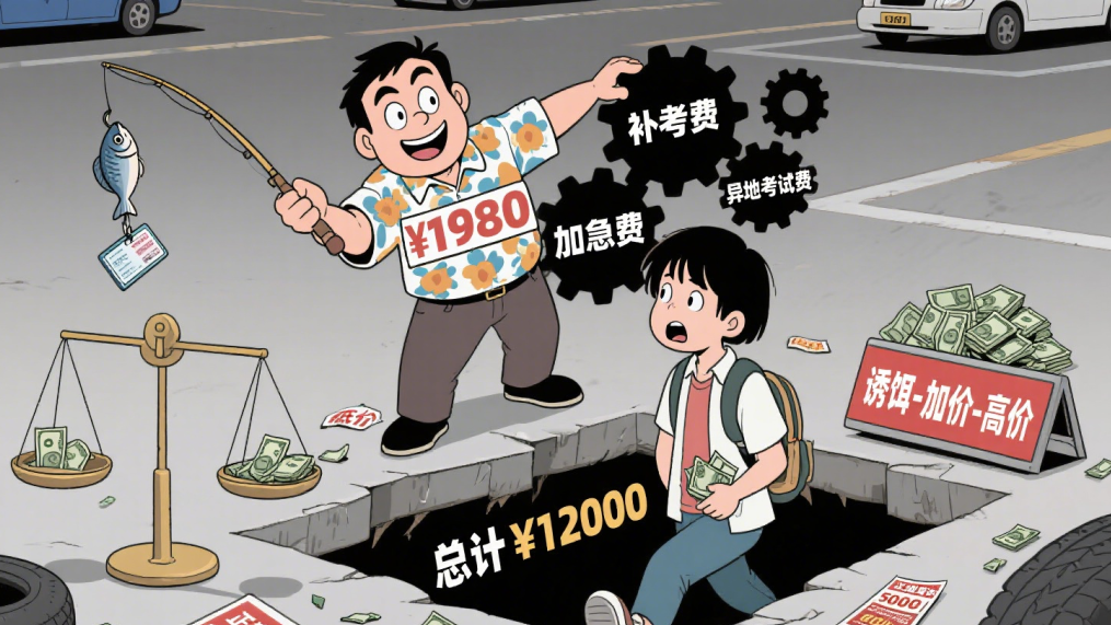 “低价”是诱饵,后续以“补考费”、“异地考试费”、“加急费”等层层加价,最终花费常远超正规驾校标准。