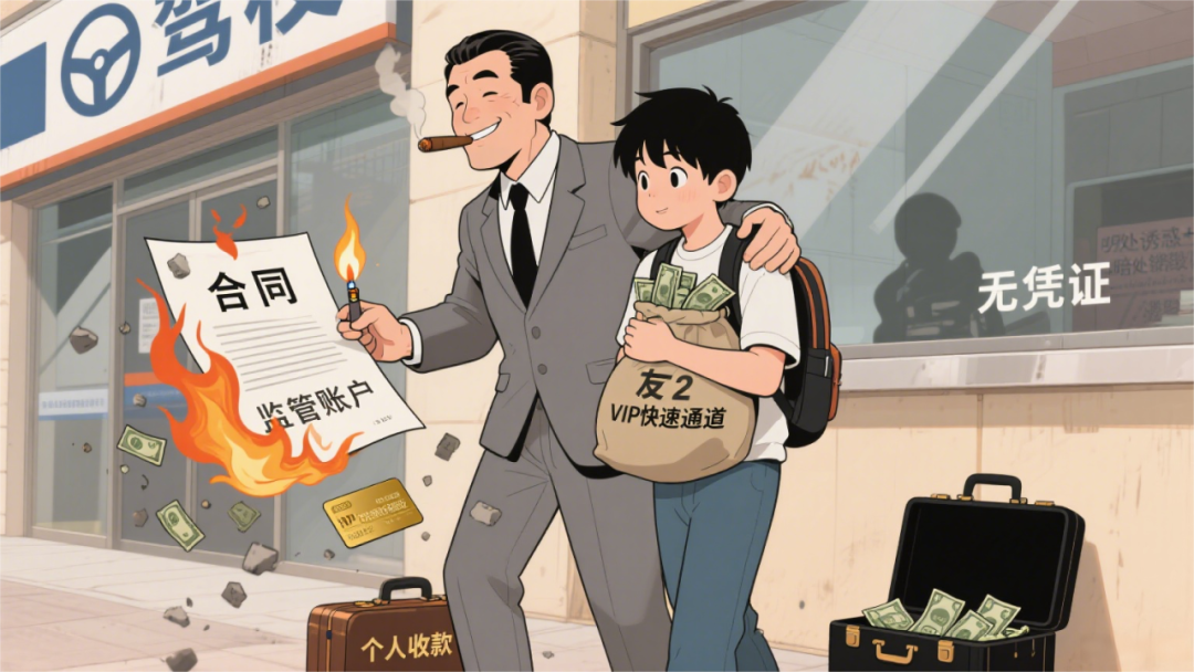 多为个人/中介代理,未签正规合同,费用未入监管账户。出事难举证维权。“黑驾校”可能还会伪造公章、收据欺骗学员,投诉无门。