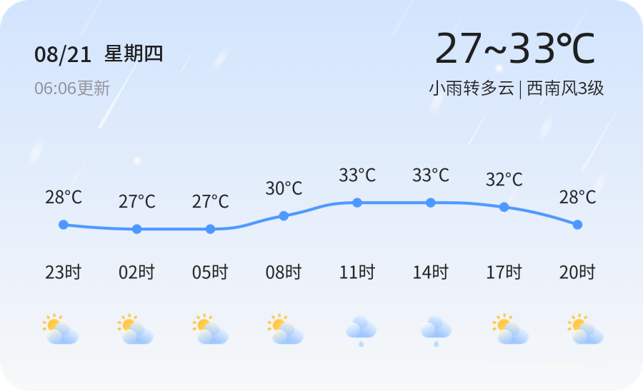 今天是2025年8月21日,星期四,农历闰六月廿八。烟台市今日天气为小雨转多云,气温介于27℃至33℃之间,西南风3级,空气湿度高达98%。空气质量方面,PM2.5指数为30,属于优级,适合户外活动。市民出行时建议携带雨具,以备不时之需。预计今日气温较高,体感闷热,建议市民注意防晒和补水。
