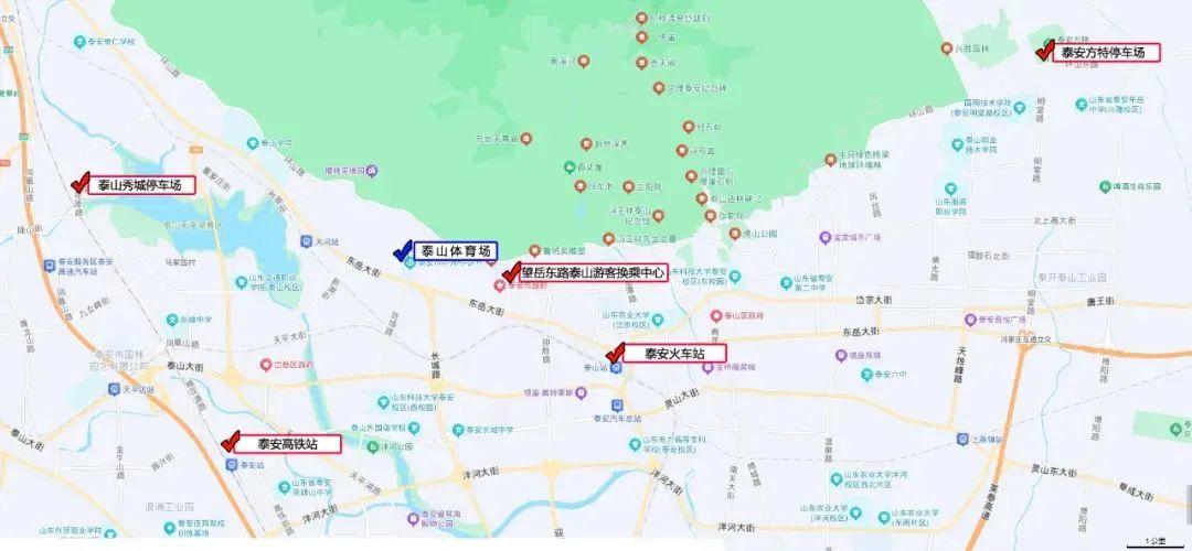 泰山秀城停车场、望岳东路泰山游客换乘中心停车场、泰安方特停车场、泰安高铁站、泰安火车站。