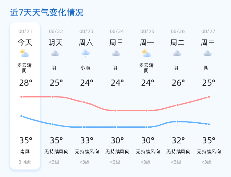 今天夜间多云转阴,南风2级,气温28~35℃,明天天气阴,气温跟今天差不多,最高气温35℃, 最低气温25℃。