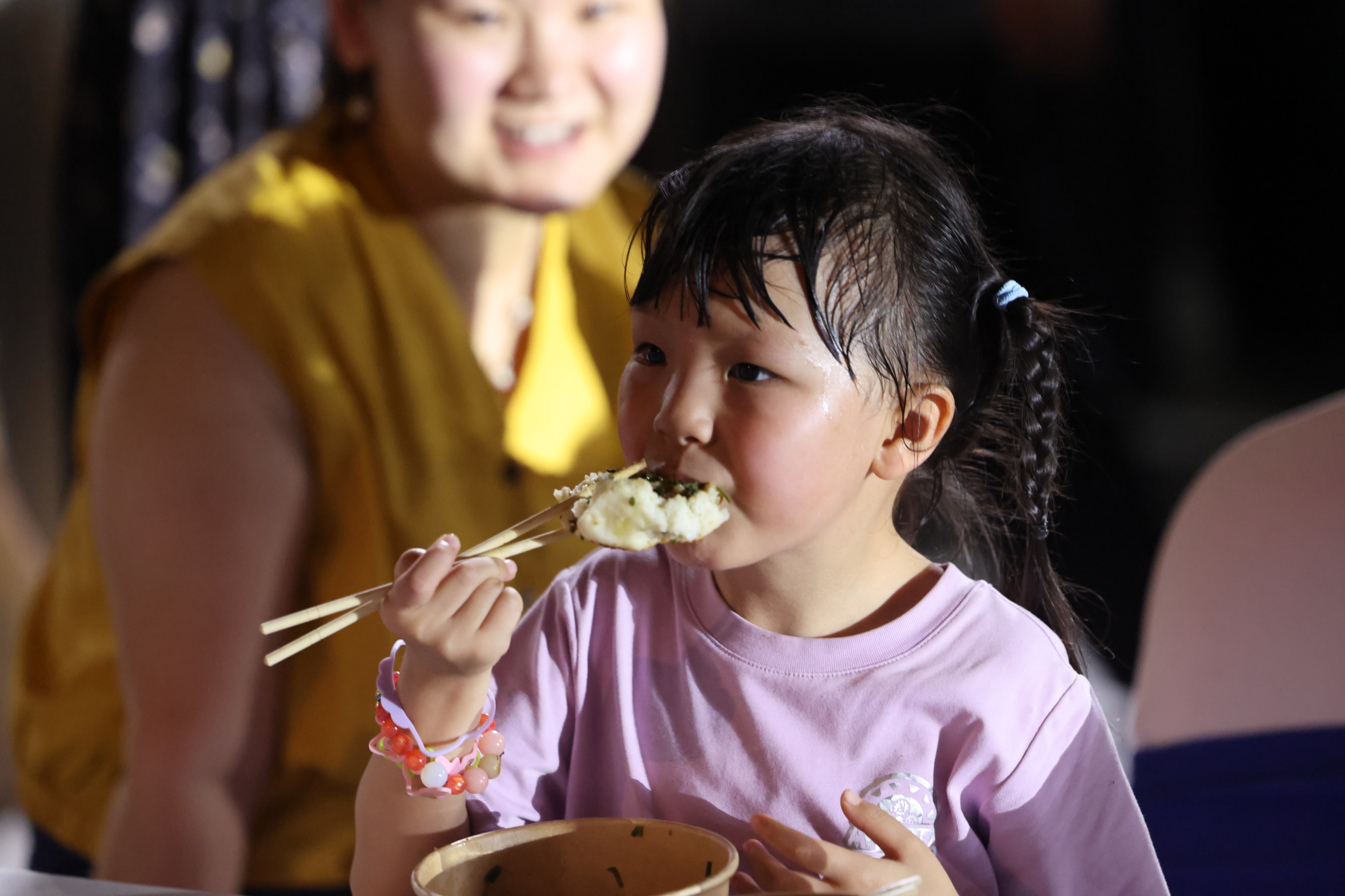 与长桌相邻的“包”教包会·鲁味面塑互动区同样人气高涨。非遗代表性传承人的展位被众多亲子家庭围绕。晚七点的水煎包面塑课上,孩子们在家长和指导老师协助下认真捏制,不一会儿,憨态可掬的“小包子”面塑便摆满桌面。一小时后,面团又在巧手中化作市花荷花、黄河口大闸蟹等造型。很多小朋友在零基础体验中感受到非遗魅力,临行时不仅带走作品,更留存了文化与美食结合的记忆。