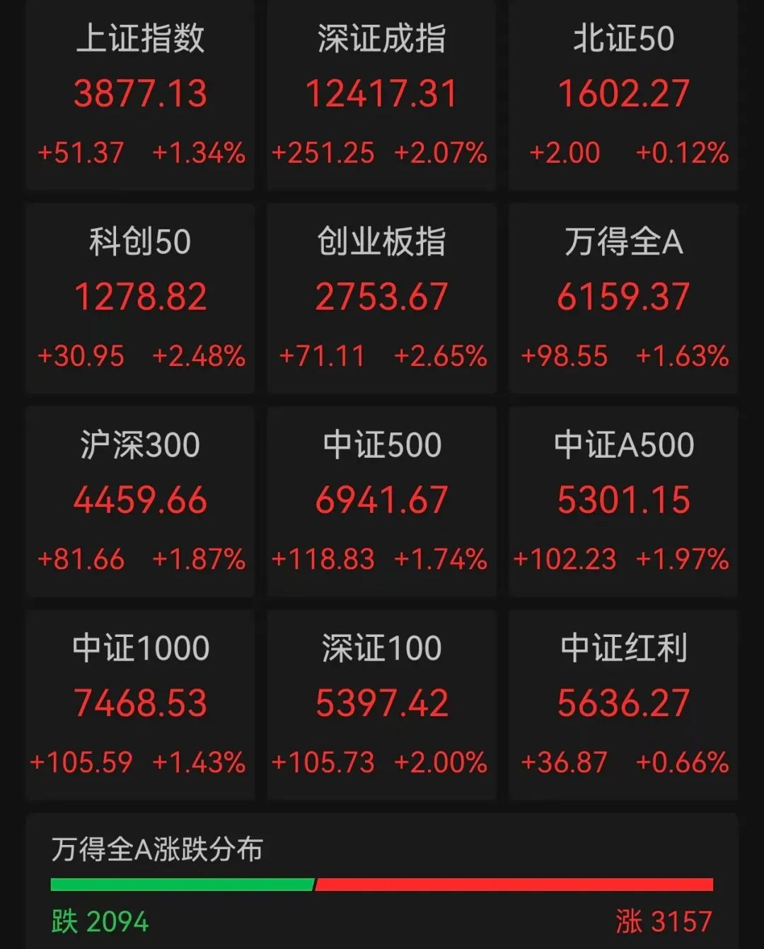 三大股指今日集体收涨,沪指报收3883.56点,涨1.51%,深成指报收12441.07点,涨2.26%,创业板指报收2762.99点,涨3%。房地产、白酒、通信、贵金属、生物科技行业涨幅靠前,算力、稀土永磁、CPO、卫星互联网、人工智能、机器人概念股大涨。