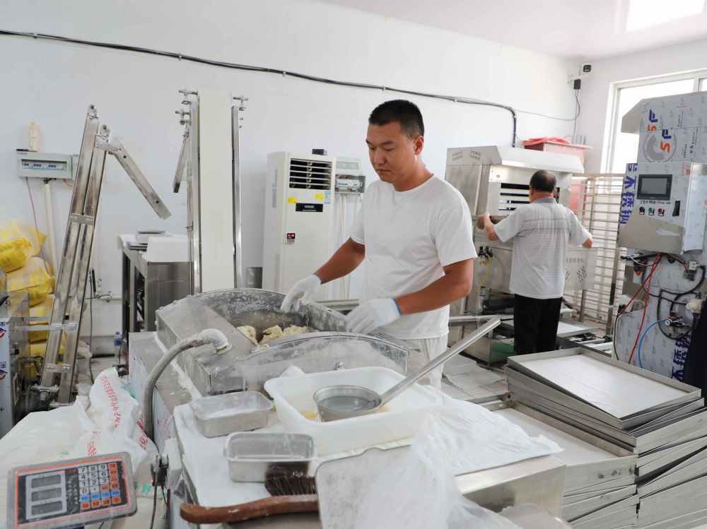 在高里街道河南村村委,每天凌晨三点和下午三点半,全自动的馒头生产线开始运转,村支书张中华戴着白手套,与其他七名村民一起,平均每天生产一万余个馒头销往周边的商超、市集和企业食堂。