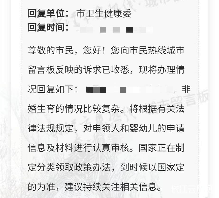 “非婚生子女可以享有这个补贴吗?”就在系统开放的前几天,武汉的张女士提出这个疑问,为此她通过市民热线咨询了武汉市卫健委。