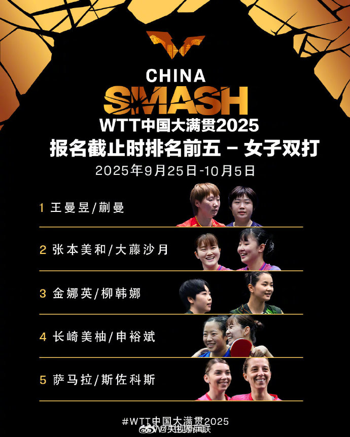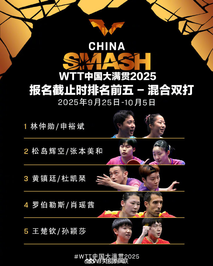 孙颖莎王楚钦混双出战!WTT中国大满贯2025双打名单公布快讯 | 2025-08-27 13:04:30来源:@央视新闻9月25日至10月5日,WTT中国大满贯2025将在北京石景山首钢园举行。报名截止时,排名前五名单如下↓↓转发,为国乒加油!责任编辑:姜凯宁