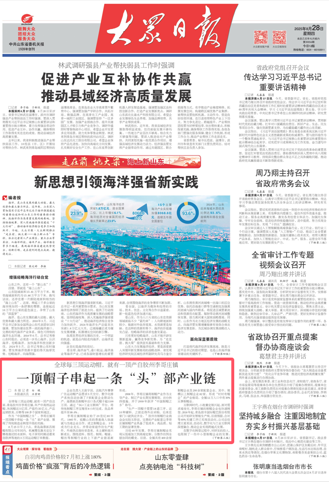 今天(8月28日)出版的人民日报、大众日报,同时报道了胶州李哥庄镇——“中国制帽之乡”。