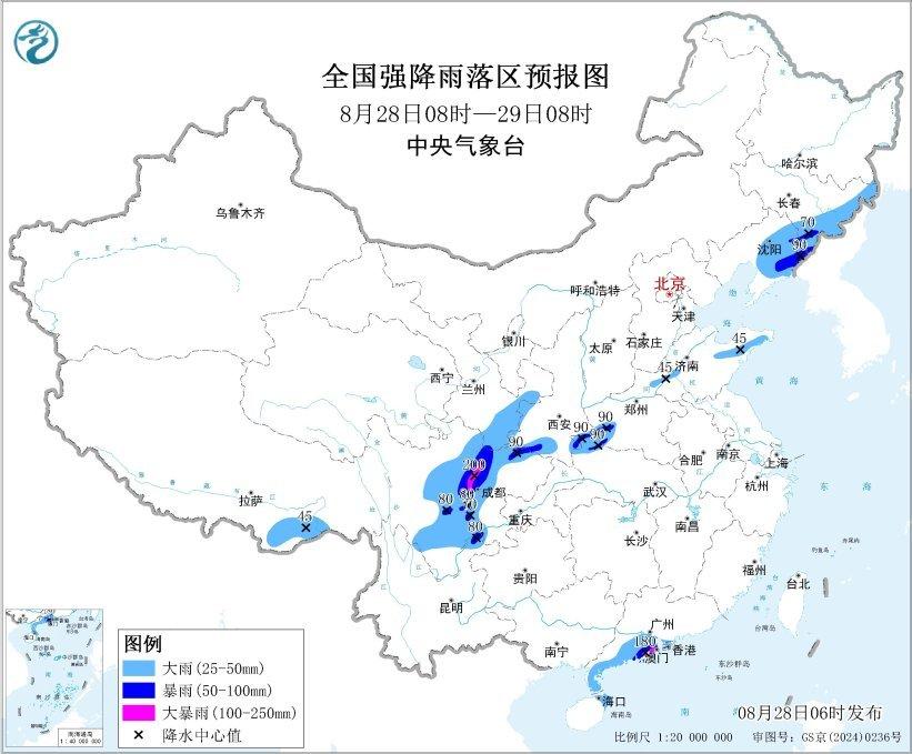预计,8月28日08时至29日08时,吉林东部、辽宁中东部、西藏东南部、甘肃东部和南部、陕西中南部、山东中北部、河南西部、湖北西北部、川西高原、四川盆地西部和南部、云南东北部、广东中西部等地部分地区有大到暴雨,其中,四川盆地西部、广东西南部沿海等地局地有大暴雨(100~200毫米)。上述部分地区伴有短时强降水(最大小时降雨量20~50毫米,局地可超过70毫米),局地有雷暴大风等强对流天气。