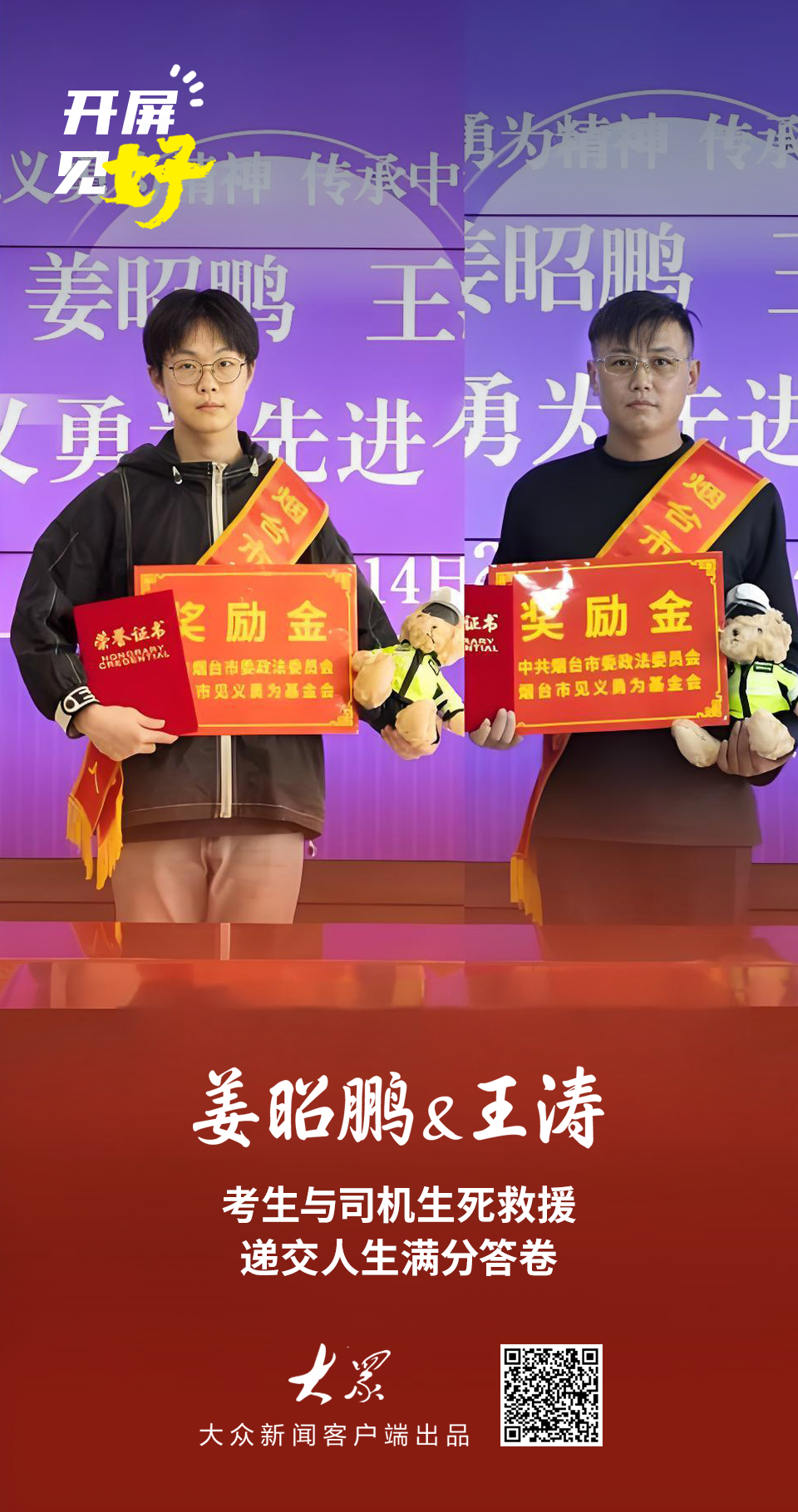 姜昭鹏,男,2006年12月生,山东城市服务职业学院2022级学生;王涛,男,1985年11月生,山东省烟台市网约车司机。2025年5月10日早上,姜昭鹏和同学乘网约车赴考途中,同行同学突发心脏骤停。姜昭鹏立即运用所学急救知识,争分夺秒对同学进行心肺复苏、人工呼吸等急救,整个过程沉着冷静。同时,司机王涛联系交警说明情况,获准后连闯6个红灯,将15分钟车程压缩至7分钟,迅速抵达烟台山医院东院区。两人上演7分钟“生死时速”,成功救回命悬一线的同学。