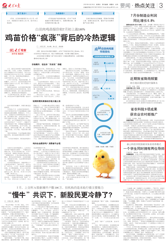 8月28日,3版要闻刊发《一个学生同时拥有两位导师》,报道泰山科技学院探索双体系培养模式。详情请点击这里—《一个学生同时拥有两位导师》