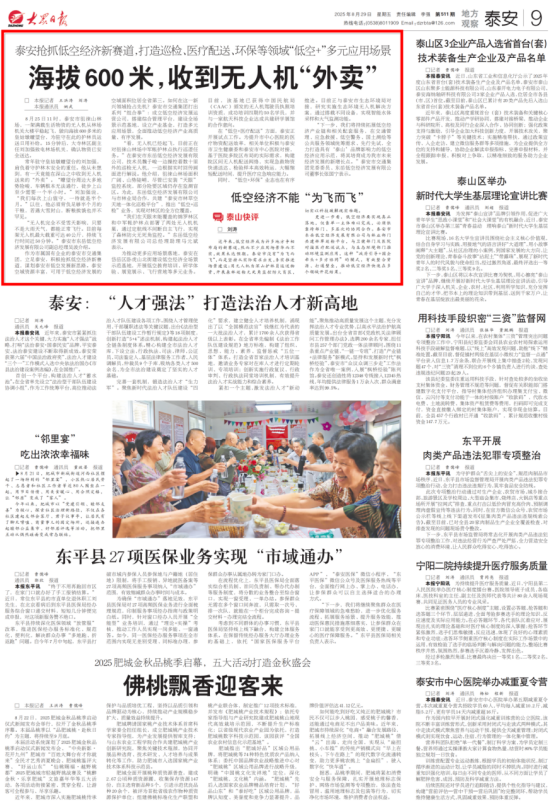 8月29日,大众日报泰安版推出重磅策划,报道泰安抢抓低空经济新赛道,打造巡检、医疗配送、环保等领域“低空+”多元应用场景。详情请点击这里—