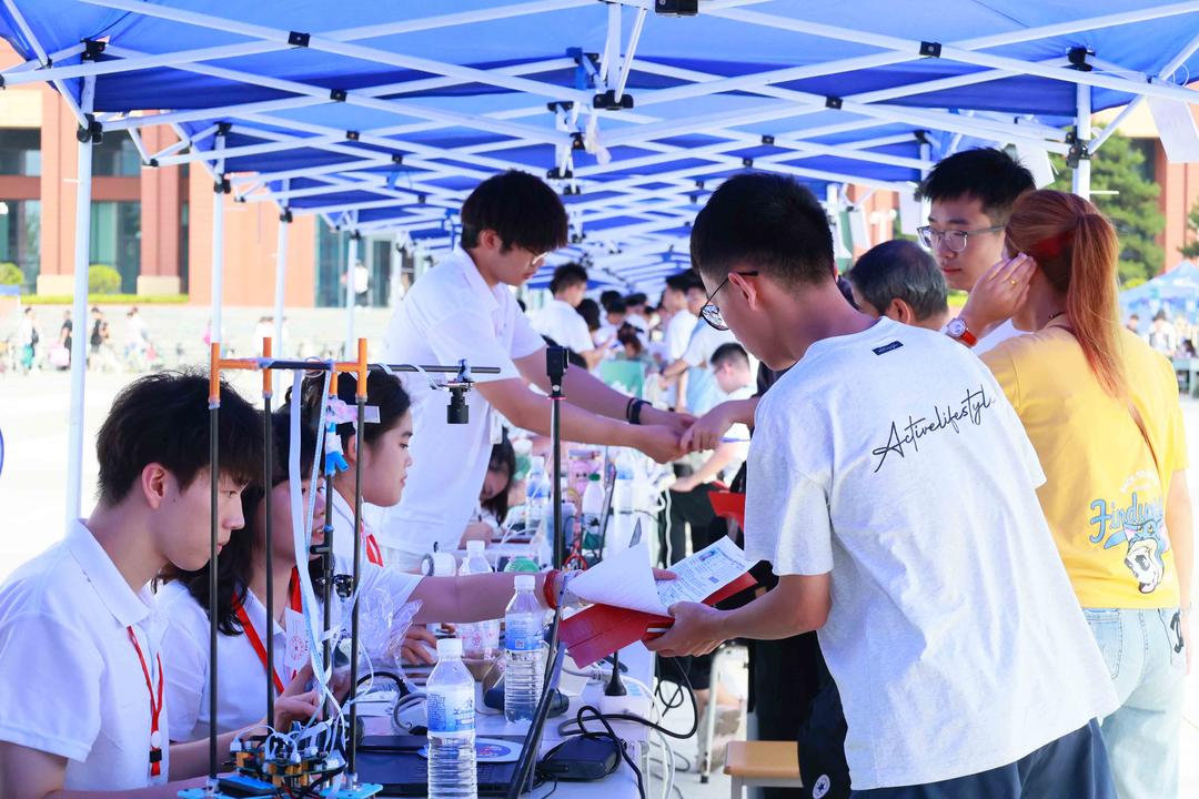 迎新现场,信息与控制工程学院无人机灵活起飞、智能羽毛球收集装置高效运行、智能义肢精准响应、送药小车穿梭演示……各类学生自主搭建的科创作品吸引新生驻足了解。