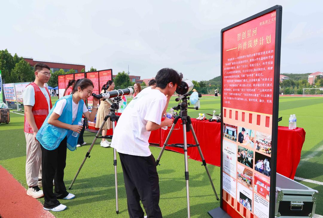 理学院推出“科技+思政”双轮驱动迎新活动,“梦想投石机”展区前,新生通过亲手调试机械结构、测算投射角度,在实践中感受力学原理与工程思维;“智创星河”展区的天文望远镜旁,志愿者结合星图讲解天体运行规律,让新生在趣味互动中触摸专业温度、筑牢理想根基。“通过科技载体将专业知识与价值塑造有机结合,引导新生树立‘用理科力量服务社会’的成长方向。”理学院党委副书记薛诚表示。