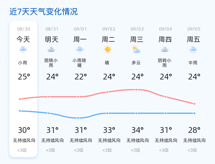 未来三天,菏泽市天气将以小雨转晴为主,气温将在22℃至31℃之间波动。其中,9月1日有小雨转晴,9月2日和9月3日天气晴朗或多云,9月4日再次迎来阴雨天气,9月5日则有中雨。市民需根据天气变化适时增减衣物,注意防暑降温。