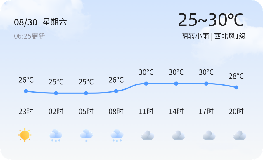 今日是8月30日,农历七月初八,菏泽市迎来阴转小雨的天气。全市各区普遍阴有小雨,气温在25℃至30℃之间,西北风1级,空气湿度较高,达到85%,PM2.5指数为26,空气质量良好。市民出行请注意携带雨具,注意防滑。