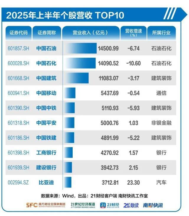 个股营收TOP10以“两桶油”、基建“铁军”以及运营商等中字头企业为主,TOP3分别是中国石油(601857.SH)、中国石化(600028.SH)和中国建筑(601668.SH),其中“两桶油”上半年营收均超1.4万亿元,中国建筑营收也突破1万亿。