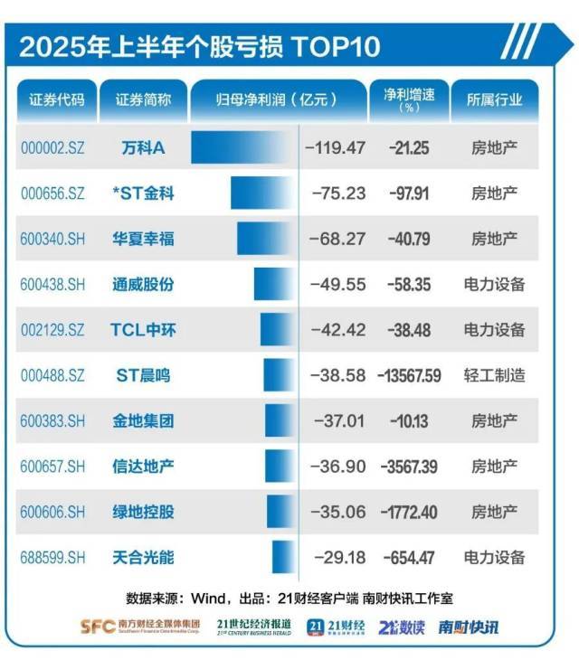 个股亏损TOP10主要来自房地产(6家)和电力设备行业(3家),3家电力设备公司均属光伏领域。亏损额最高的万科A(000002.SZ),在上半年亏损超110亿元。万科在半年报中解释称,报告期内业绩亏损的主要原因包括房地产开发项目结算规模显著下降,毛利率仍处低位;结合行业、市场和经营环境变化,考虑到业务风险敞口升高,新增计提了资产减值;部分大宗资产交易和股权交易价格低于账面值。