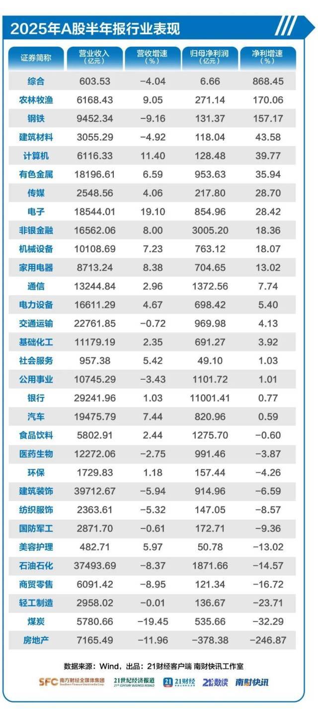 今年上半年,A股上市公司实现营收、净利双增长。据21财经·南财快讯记者统计,截至8月30日,已有5424家A股上市公司披露2025年半年报,合计实现营业收入34.99万亿元,同比增长0.02%;实现归母净利润2.99万亿元,同比增长2.45%。