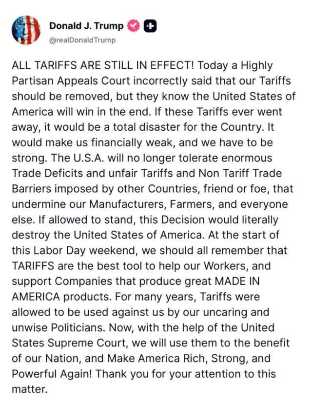 8月29日,美国联邦巡回上诉法院以7:4的投票结果作出裁决,认定特朗普政府以行政令加征制裁关税、对等关税的做法涉嫌违宪且越权。