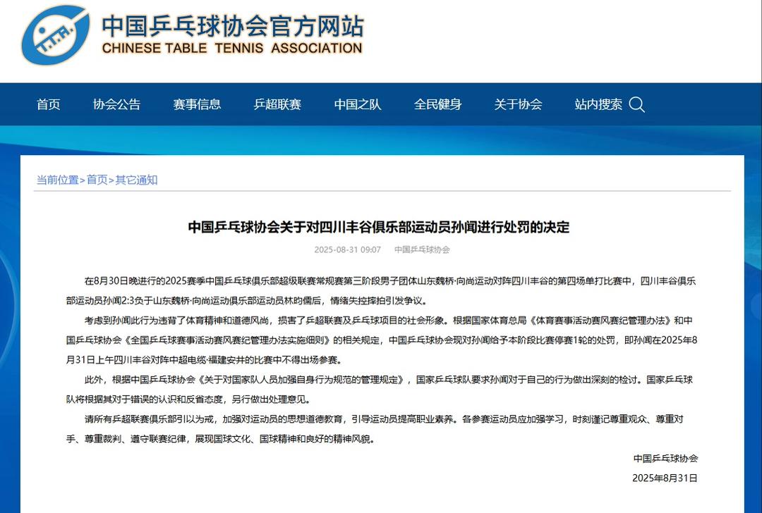 考虑到孙闻此行为违背了体育精神和道德风尚,损害了乒超联赛及乒乓球项目的社会形象。根据国家体育总局《体育赛事活动赛风赛纪管理办法》和中国乒乓球协会《全国乒乓球赛事活动赛风赛纪管理办法实施细则》的相关规定,中国乒乓球协会现对孙闻给予本阶段比赛停赛1轮的处罚,即孙闻在2025年8月31日上午四川丰谷对阵中超电缆·福建安井的比赛中不得出场参赛。