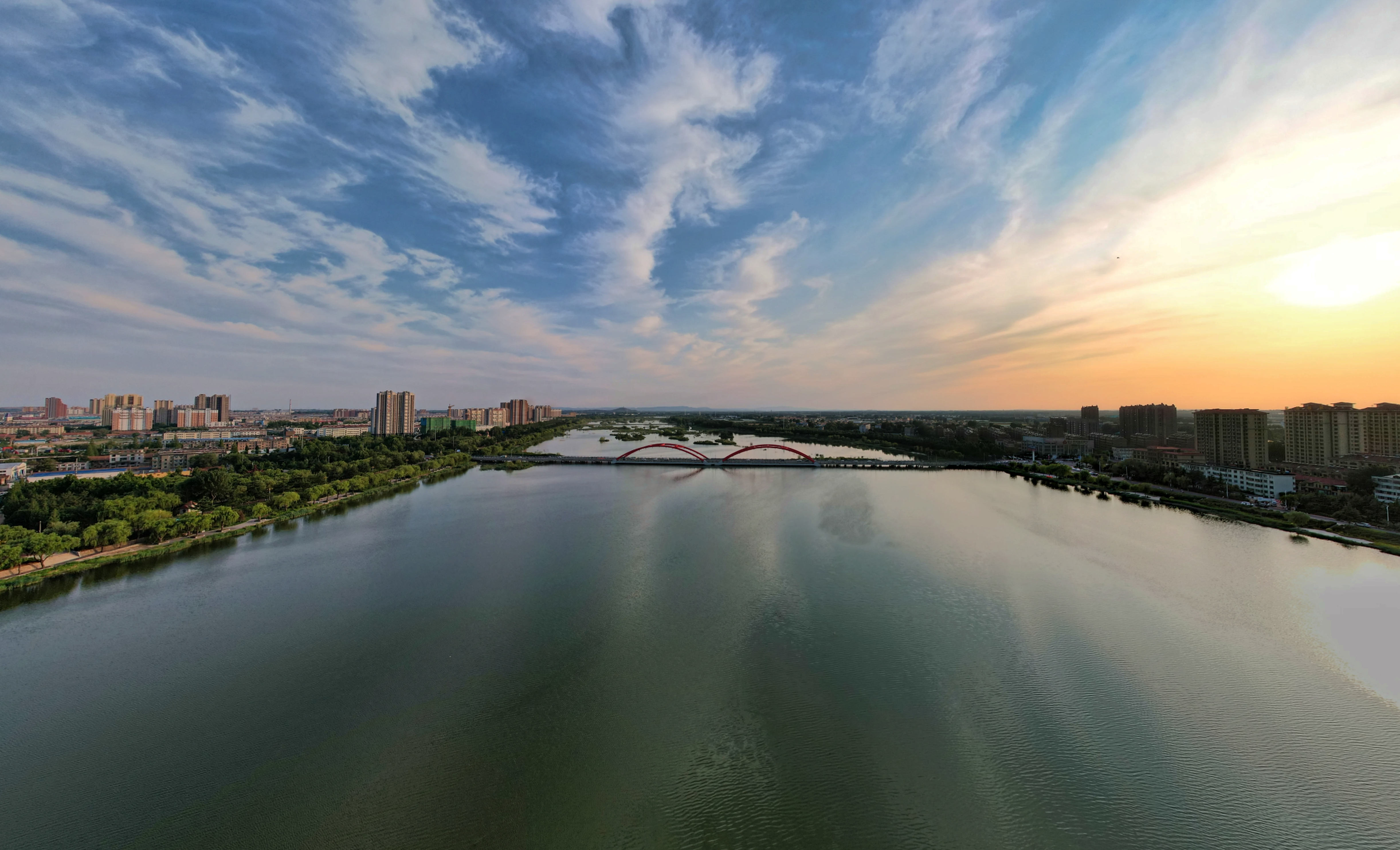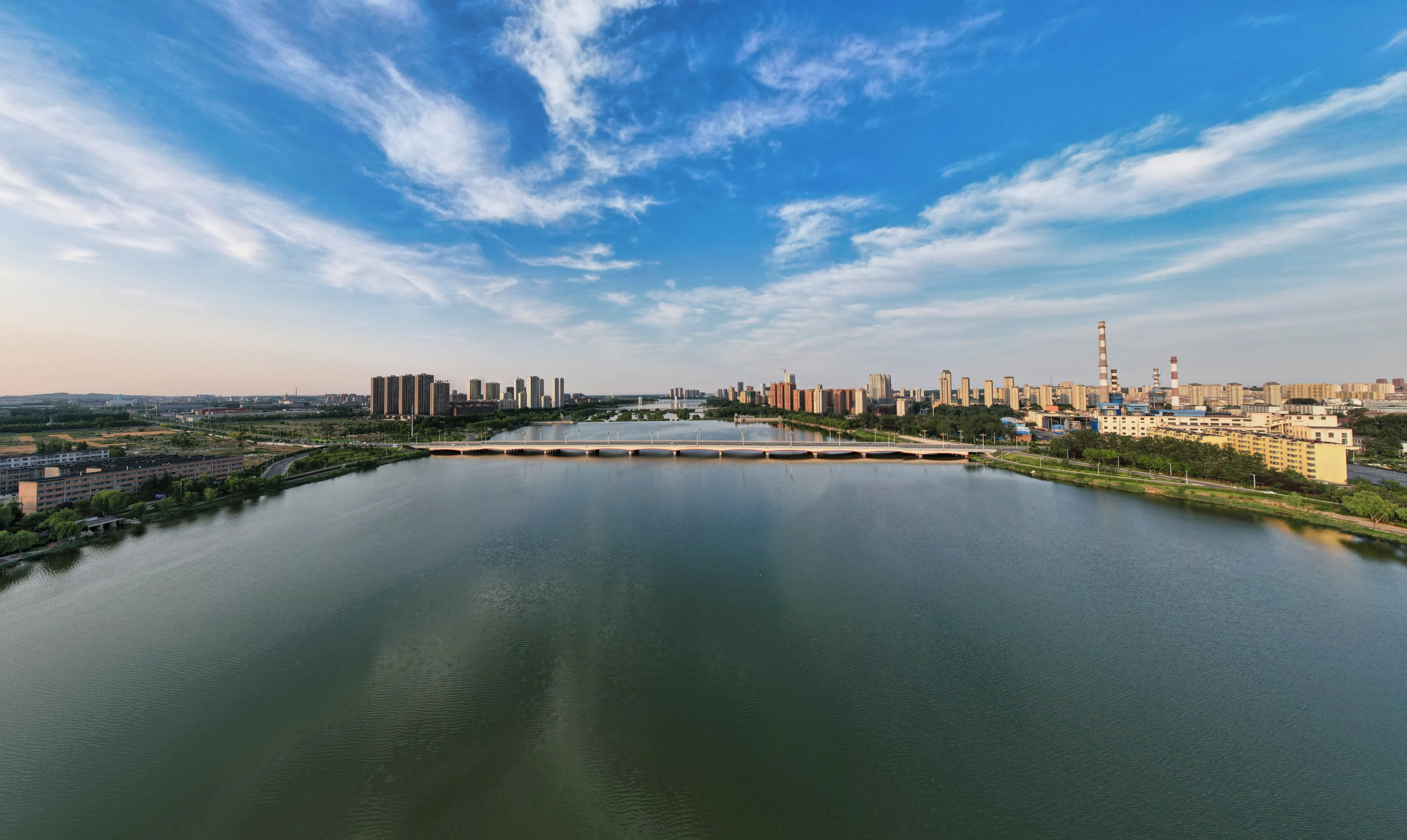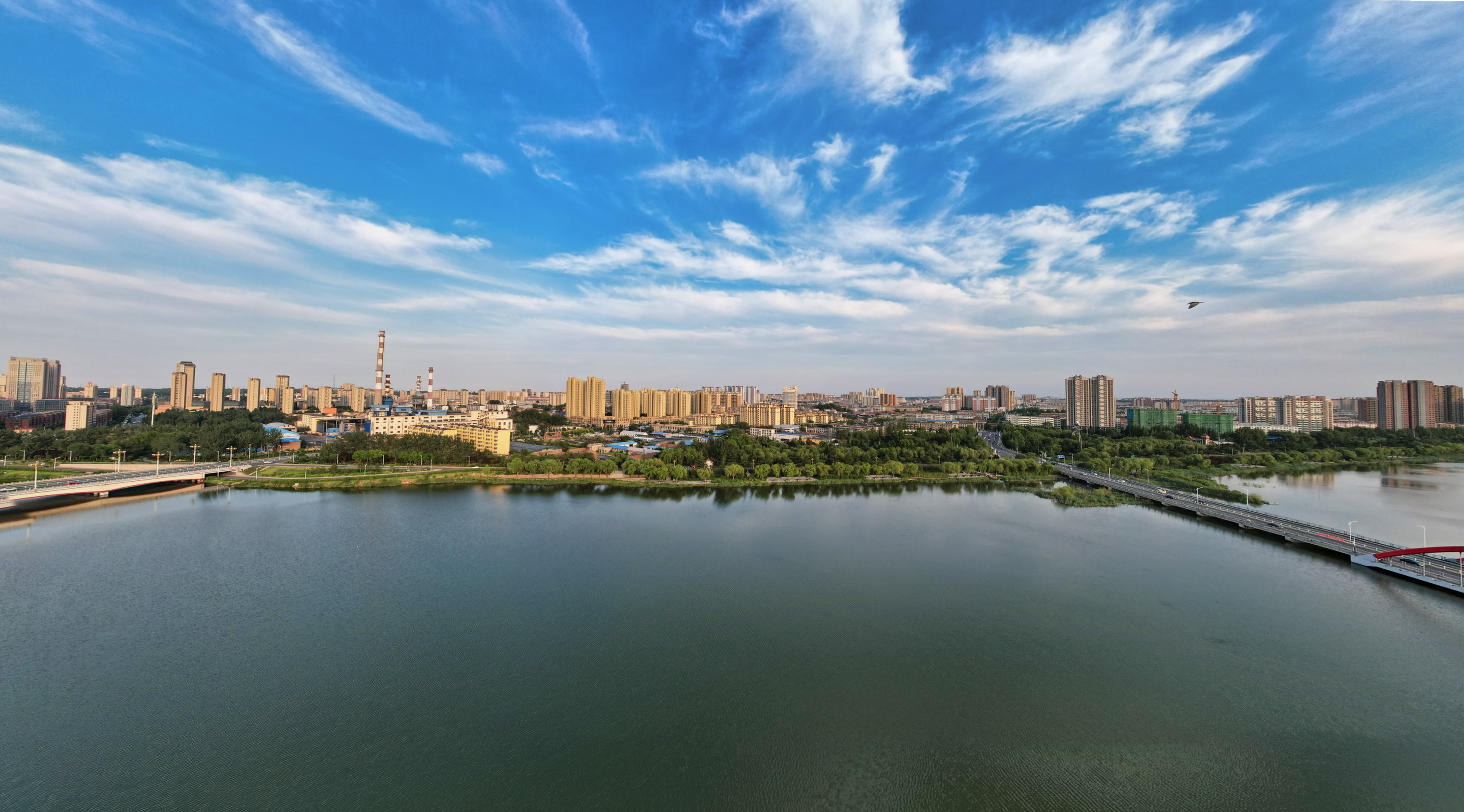 2025年夏日,航拍山东省安丘市汶河,反映出城市水利建设、河湖治理、美化绿化的成就。