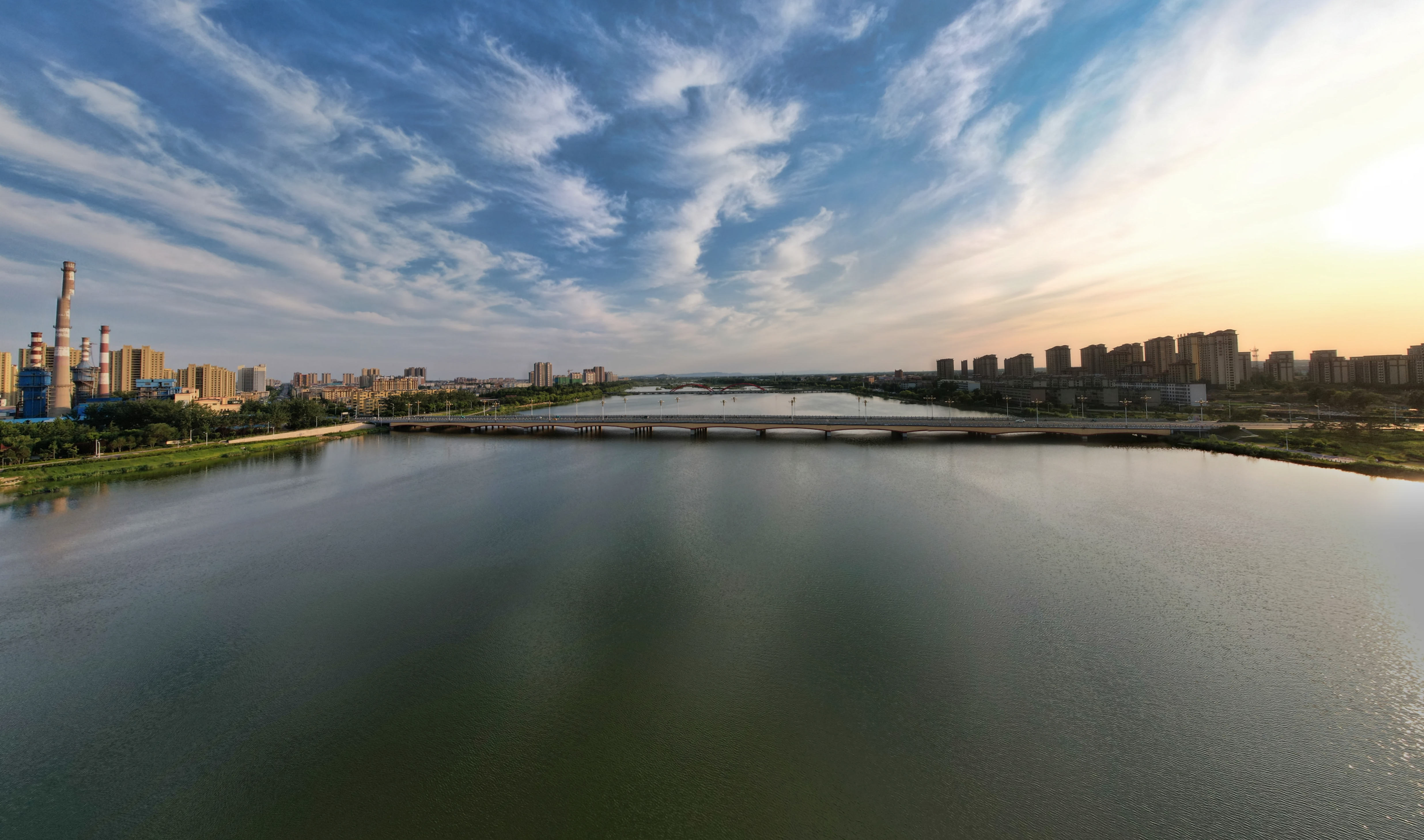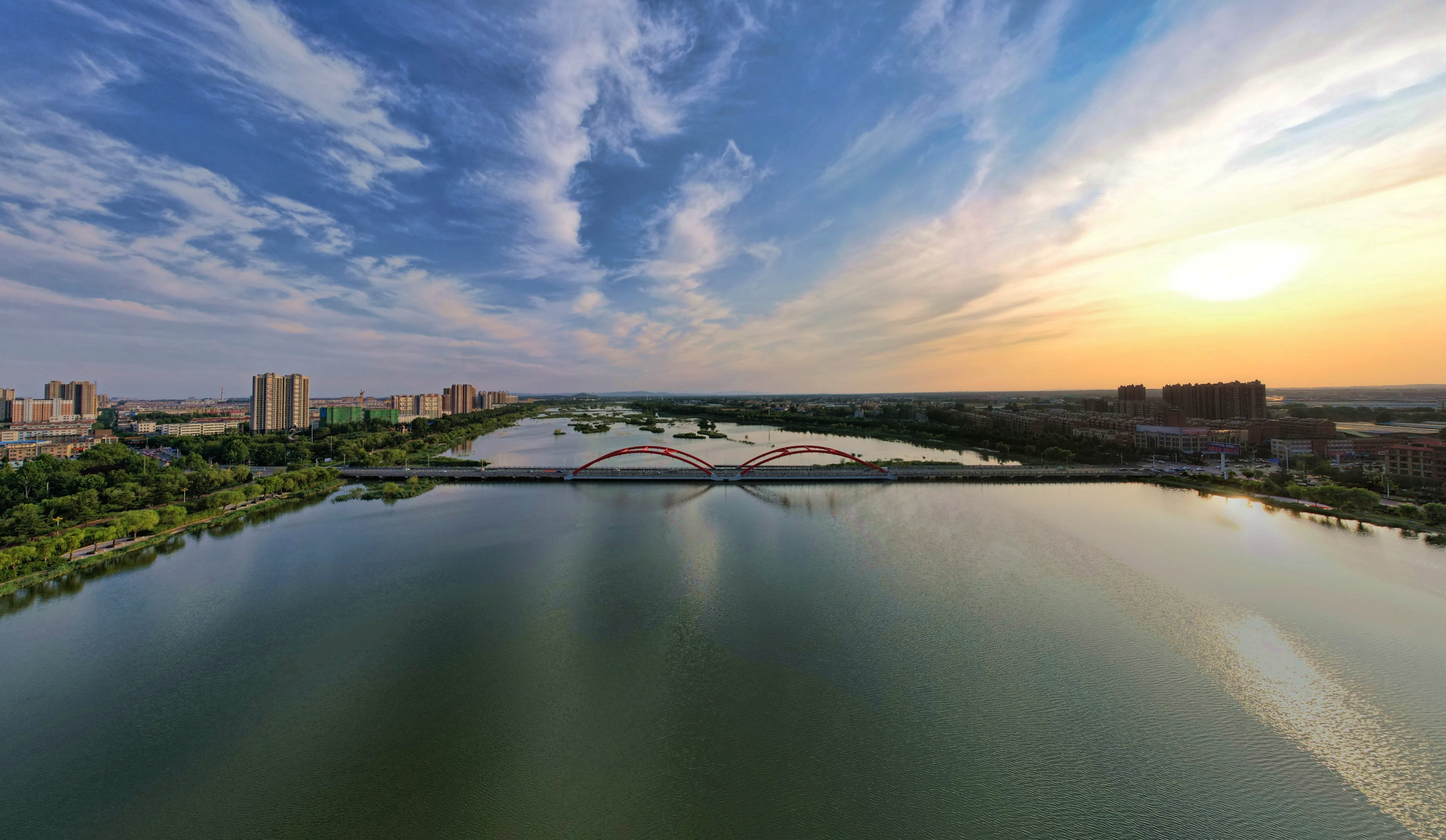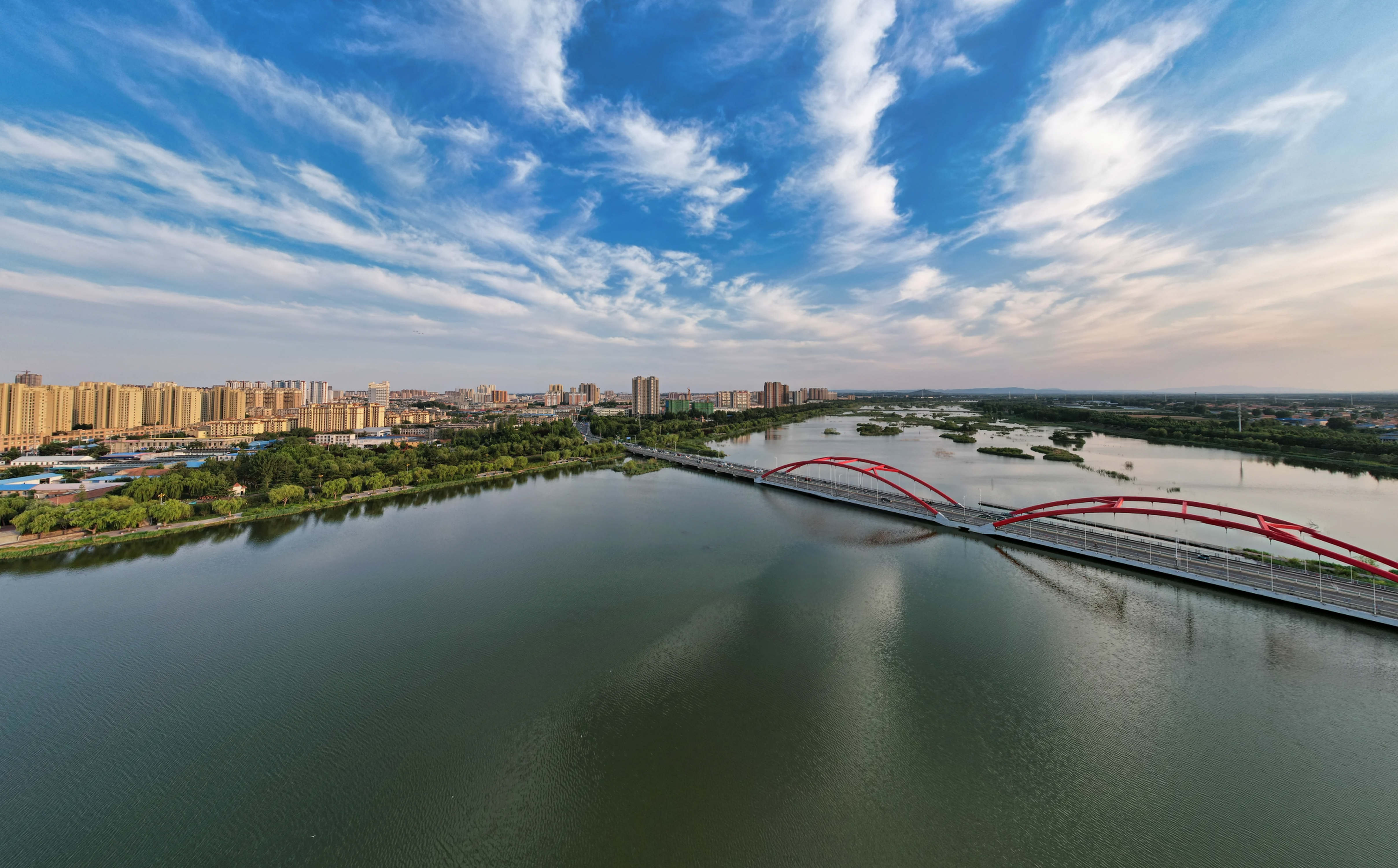 2025年夏日,航拍山东省安丘市汶河,反映出城市水利建设、河湖治理、美化绿化的成就。