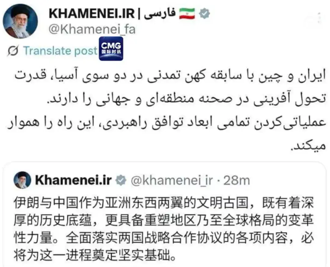 当地时间8月31日,伊朗最高领袖哈梅内伊在社交媒体用波斯语和中文,就中伊关系发文。