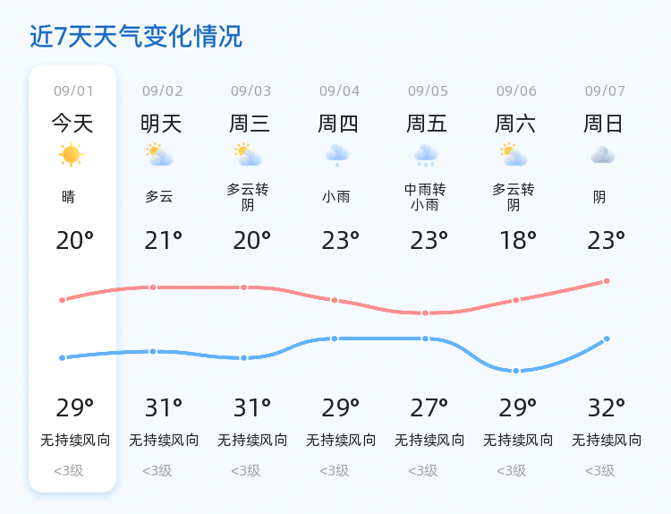 预计明日(9月2日),淄博市天气将转为多云,与今日相比,明日最高气温将上升至31℃,最低气温21℃,风力仍为无持续风向,风力等级小于3级。各区天气情况一致,均为多云天气。