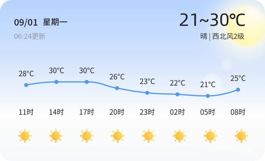 今天是2025年9月1日,农历七月初十,临沂市迎来了一天的晴朗天气。气温适宜,白天最高气温30℃,最低气温21℃,西北风2级,空气湿度89%,PM2.5指数为20,空气质量优。市民们可以放心享受户外活动,但建议注意防晒,随身携带遮阳工具,以应对较强的紫外线。