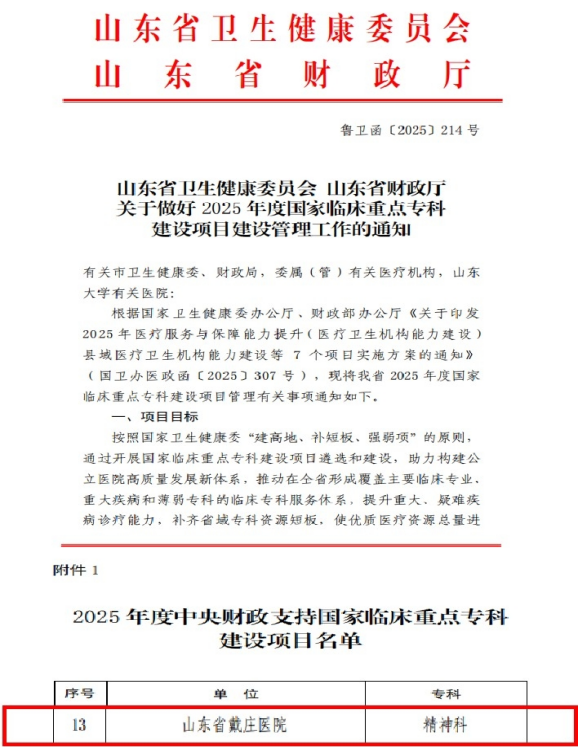 近日,山东省卫生健康委、山东省财政厅公布了《关于做好2025年度国家临床重点专科建设项目建设管理工作的通知》,戴庄医院精神科成功获批2025年度国家临床重点专科建设项目。