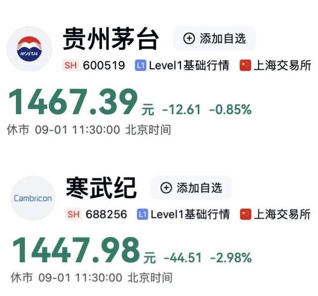 截至午间休市,贵州茅台股价为1467.39元/股,寒武纪股价为1447.98元/股。目前,它们为A股仅有的两只千元股。
