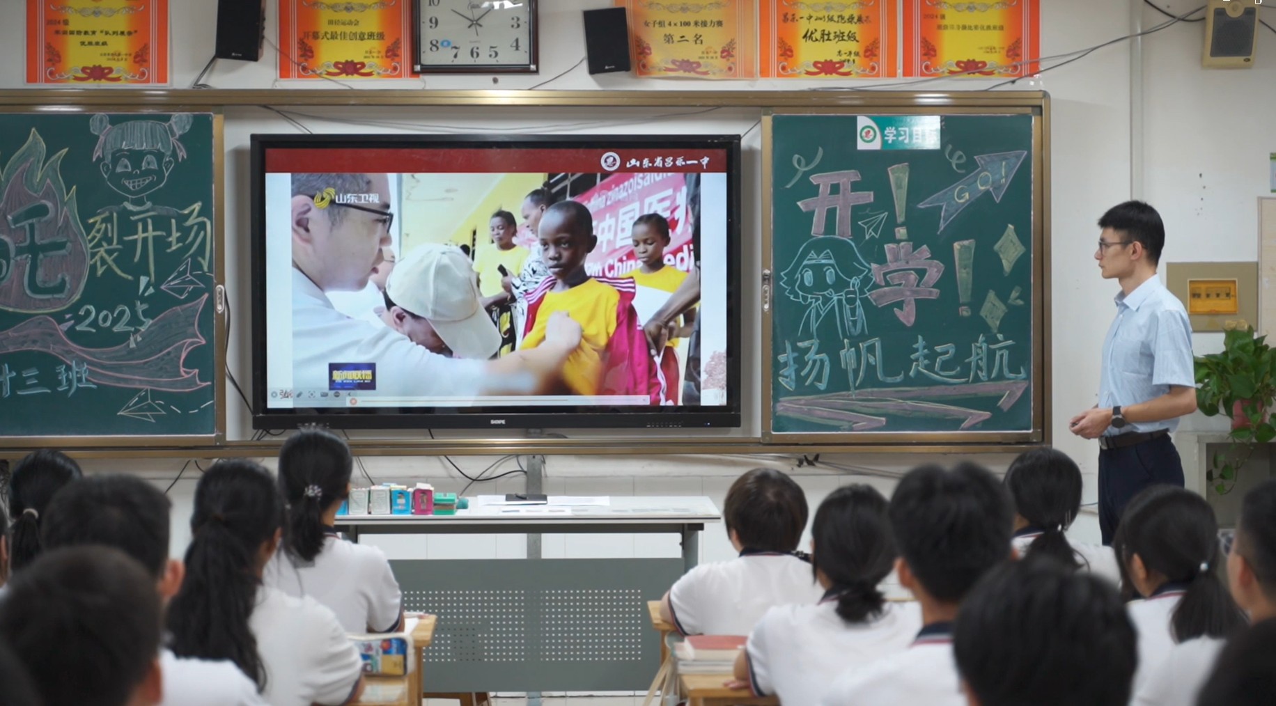 在张军桥医生的母校——昌乐一中,老师通过一段段视频、一幅幅图片,生动地讲述着校友张军桥医生的成长经历、援鄂抗疫和援坦工作,以及他发起“心跳行动”公益活动普及急救知识等事迹,展现了他医者仁心、无私奉献的高尚品格。同学们沉浸其中,被他的精神深深打动,内心充满了敬佩和感动。