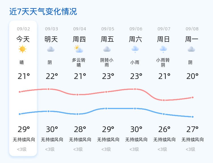 今天是9月2日,星期二,农历七月十一。潍坊市今日天气为晴转阴,最高气温29℃,最低气温21℃,目前温度为20.9℃,东风1级,空气湿度100%,PM2.5指数为36。全市各区天气情况总体平稳,以晴转阴为主,风力较小,适合户外活动。明天天气情况与今天相比,气温略有上升,最高气温将达到30℃,最低气温为22℃。天气状况为阴天,风力依旧较小,市民朋友们需注意防晒和及时补水。未来三天天气趋势显示,潍坊市气温将在21℃至30℃之间波动。其中,4日天气为多云转晴,5日可能出现阴转小雨,6日有小雨天气。市民朋友们需根据天气变化适时增减衣物,雨天出行请携带雨具,注意交通安全。温馨提示