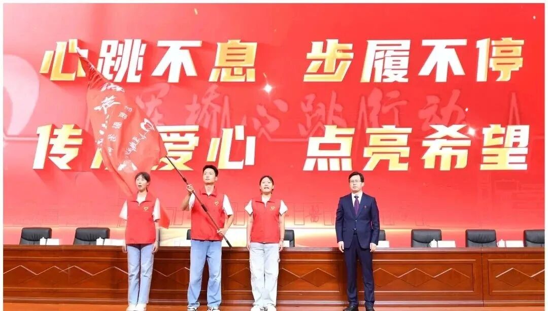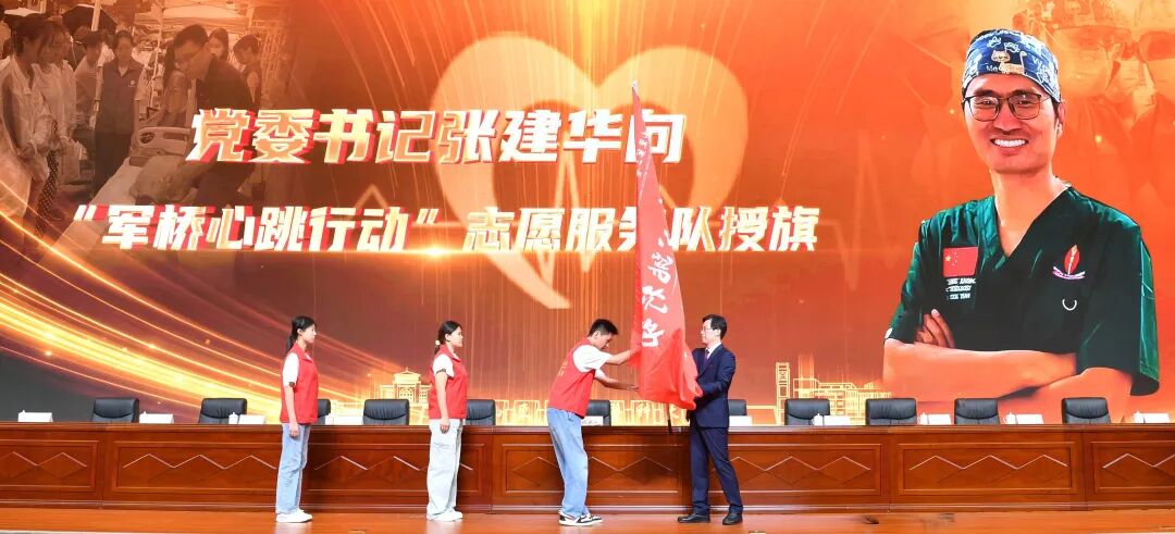 山东第二医科大学党委书记张建华为“军桥心跳行动”志愿服务队授旗。“心跳不息、步履不停,传承爱心、点亮希望!”队员庄重宣誓,铿锵誓言传递出了青年志愿者将“军桥心跳行动”传承发扬的决心,会场响起了经久不息的掌声。