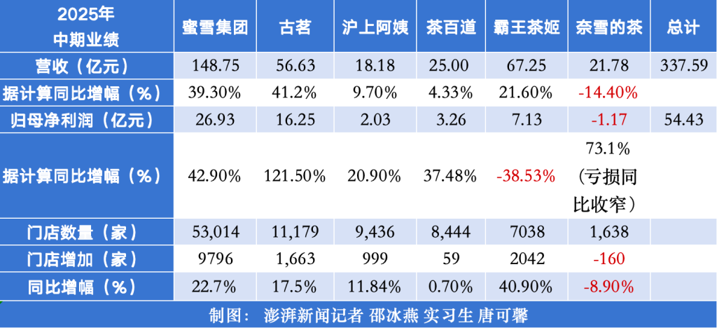 近日,蜜雪集团(2097.HK)、古茗(1364.HK)、茶百道(2555.HK)、沪上阿姨(2589.HK)、霸王茶姬(CHA.O)以及奈雪的茶(2150.HK)六家新茶饮上市公司陆续披露完2025年上半年业绩。据计算,今年上半年,六家新茶饮公司营收总计超过300亿元,归母净利润超过50亿元,大多数公司业绩实现正增长。