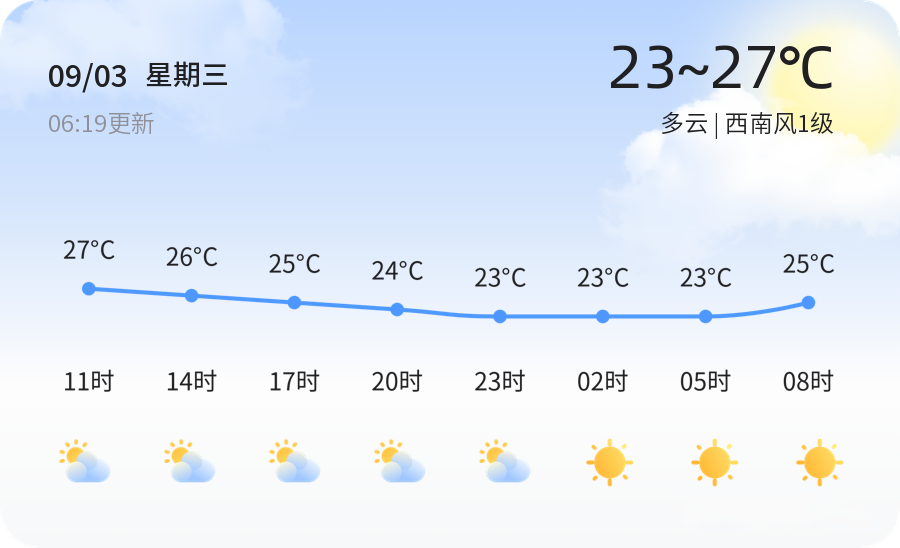 今日是2025年9月3日,星期三,农历七月十二。烟台市天气多云,气温在23℃至27℃之间,西南风1级,空气湿度较高,达90%。空气质量状况良好,PM2.5指数为43,属于良好等级。今日天气适宜出行,市民可正常进行户外活动,但需注意衣物适当,以防感冒。