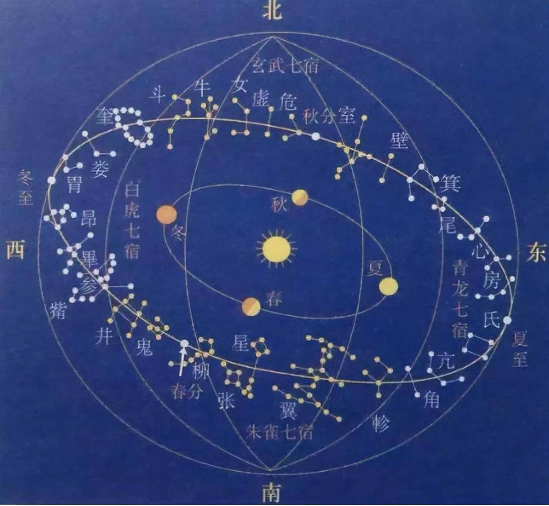 所谓“四七法”,就是将夜空中能观察到的恒星分为“东、南、西、北”四个区域,其中每个区域又分为七部分,由此形成的二十八个区域就是常说的“二十八宿”,即东方七宿:角、亢、氐、房、心、尾、箕;北方七宿:斗、牛、女、虚、危、室、壁;西方七星:奎、娄、胃、昴、毕、觜、参;南方七星:井、鬼、柳、星、张、翼、轸。如此一来,围绕地球的天体有个相应的坐标,这为之后的天文观测打下基础。譬如,千古名篇《滕王阁序》中,就有相关表述——“星分翼轸,地接衡庐”“物华天宝,龙光射牛斗之墟”……这些都是星宿文化的体现,是中国传统文化的重要组成部分。