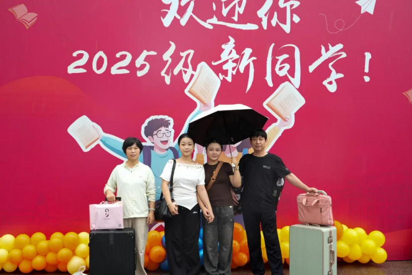 在志愿者引导下,新生吴静钰和父亲撑着伞走到迎新展板前,准备打卡拍照。她晃了晃手里的10元餐饮代金券:“刚领的,等下就去尝食堂的烟台海鲜面。”特意提前到校的她,已经“考察”过宿舍:“每层都有洗衣机和直饮水机,比想象中贴心多了。”