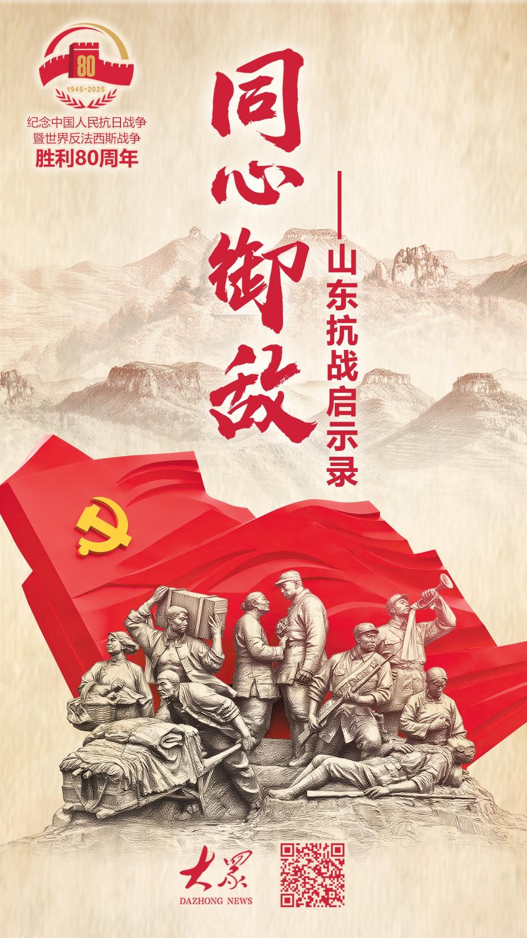 铭记历史、缅怀先烈,珍爱和平、开创未来。为隆重纪念抗战胜利80周年,大众日报·大众新闻特别推出“同心御敌——山东抗战启示录”全媒体报道,从几个侧面重温齐鲁大地的峥嵘抗战岁月,溯源山东战场“不可战胜的力量”,汲取从伟大胜利走向伟大复兴的历史启示,激励干部群众在强国建设、民族复兴新征程上勇毅前行,谱写更加壮丽的篇章。