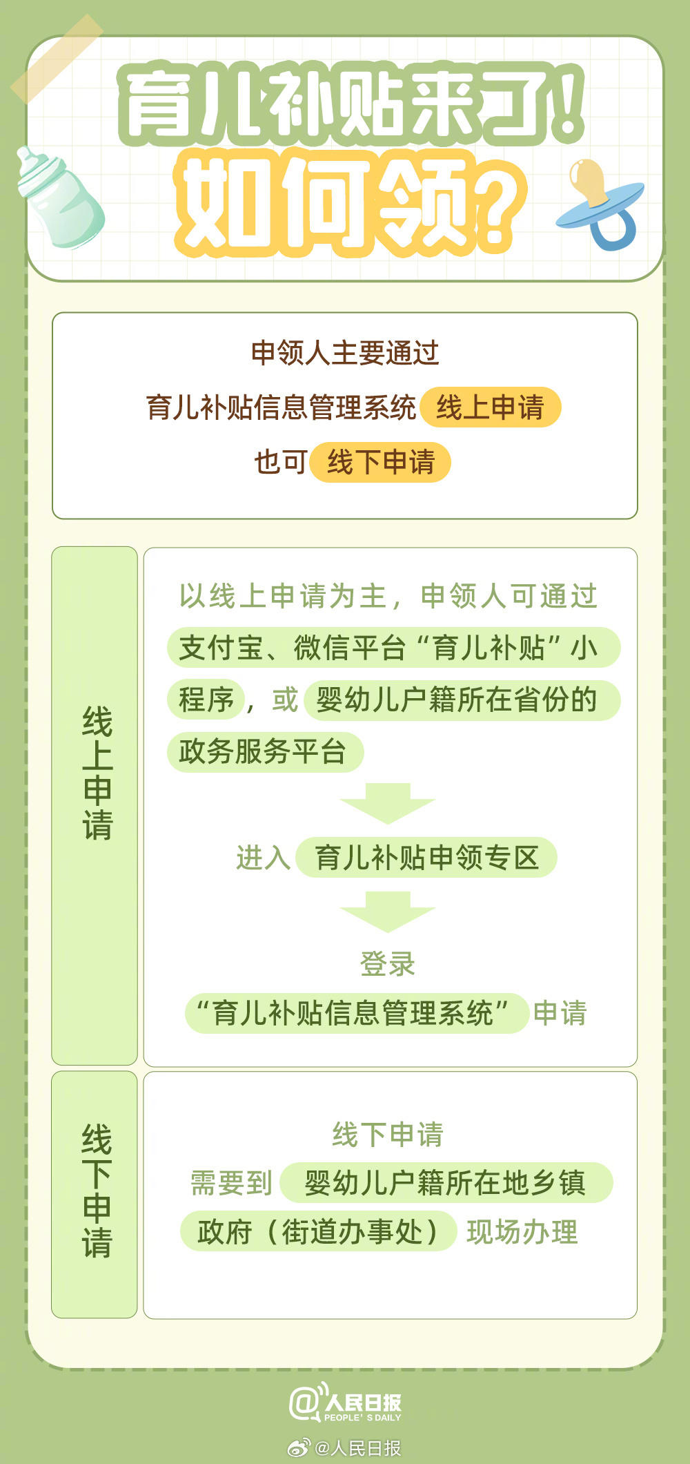 可通过支付宝、微信和各省份政务服务平台线上申领,也可到婴幼儿户籍地的乡镇政府进行申领。