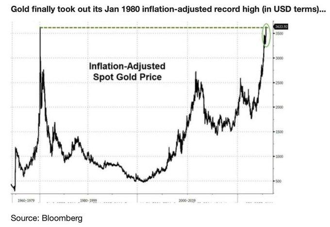 对此,有业内人士表示,黄金价格正突破1980年经通胀调整后的历史峰值——这个沉寂了45年的纪录终被打破。如此量级的行情波动显然不会出现在风平浪静的时期,通常也意味着市场正在释放信号:人们对现有货币体系的信心正在瓦解。